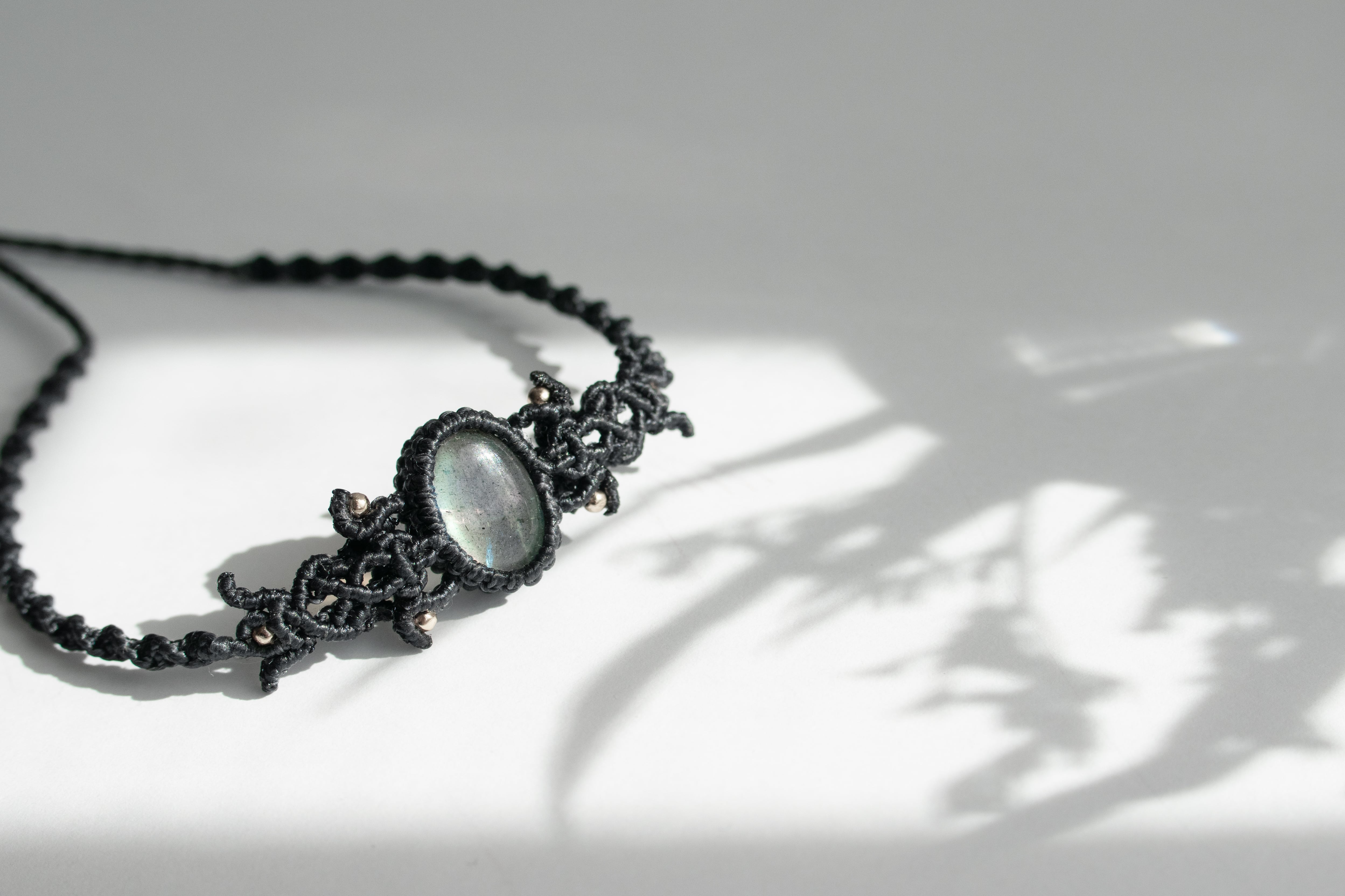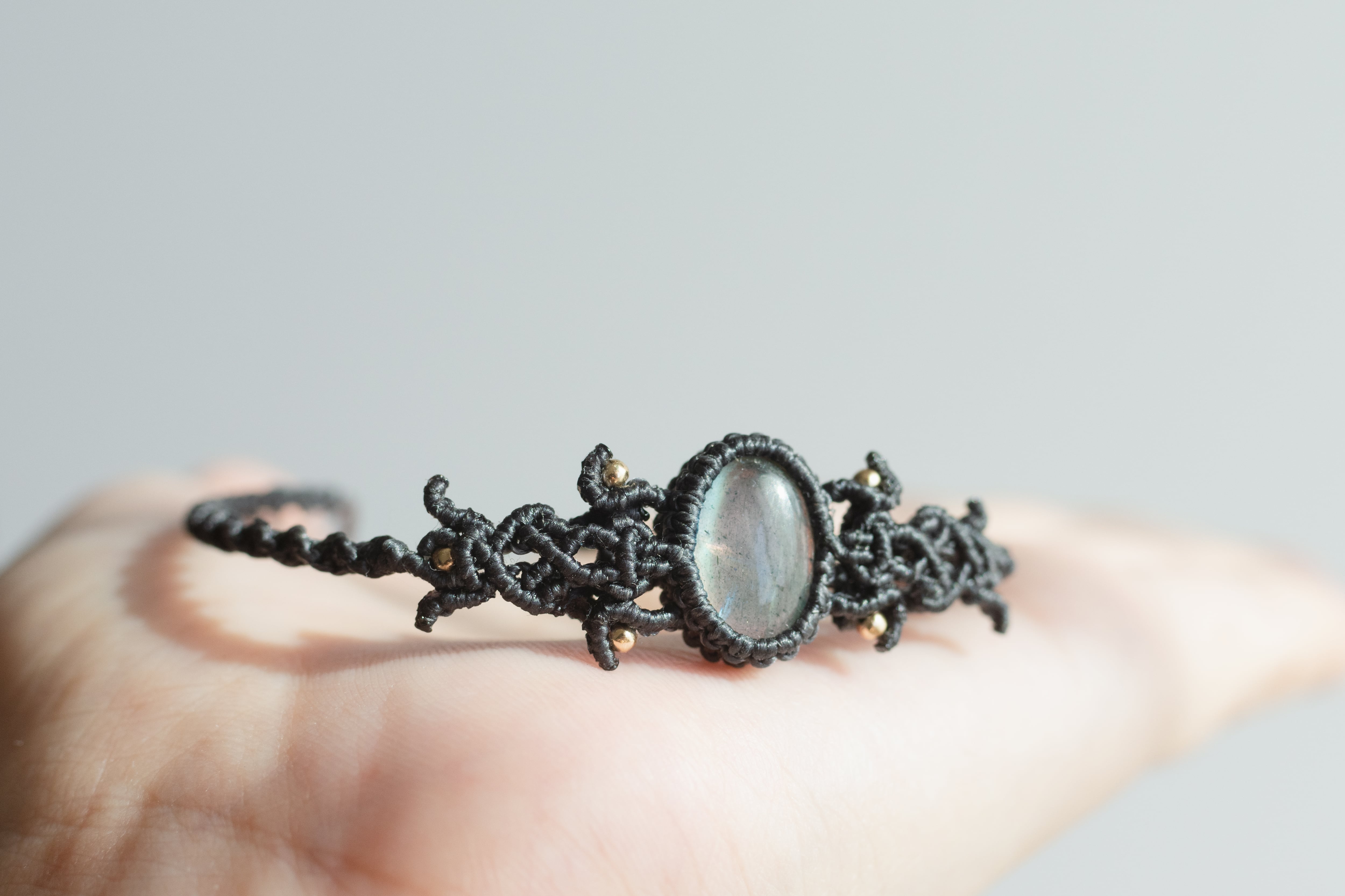 各所に紐の色が濃くなった焼き後が残りますが、マクラメジュエリーの特性として予めご了承下さい