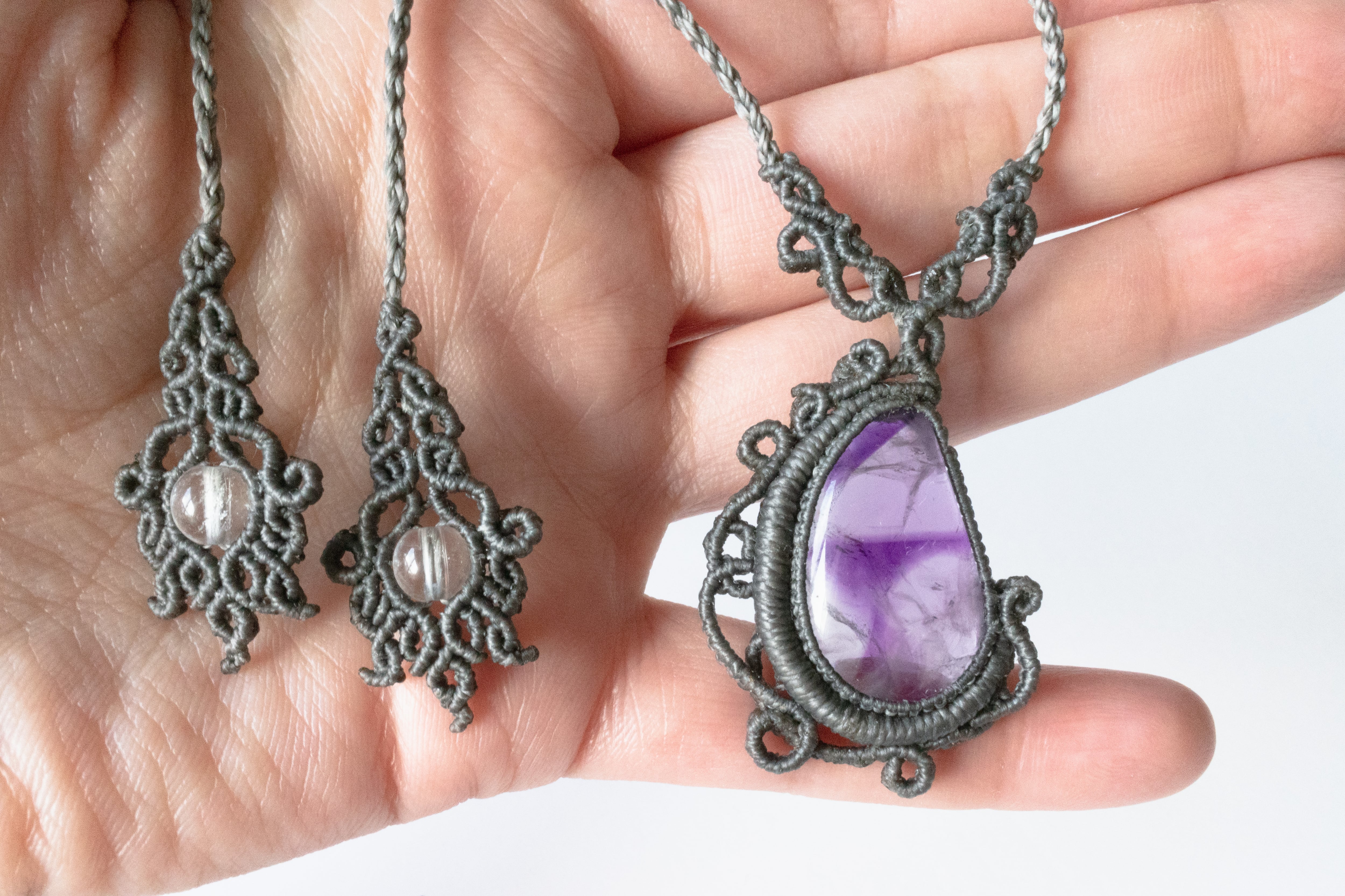 各所に紐の色が濃くなった焼き後が残りますが、マクラメジュエリーの特性として予めご了承下さい