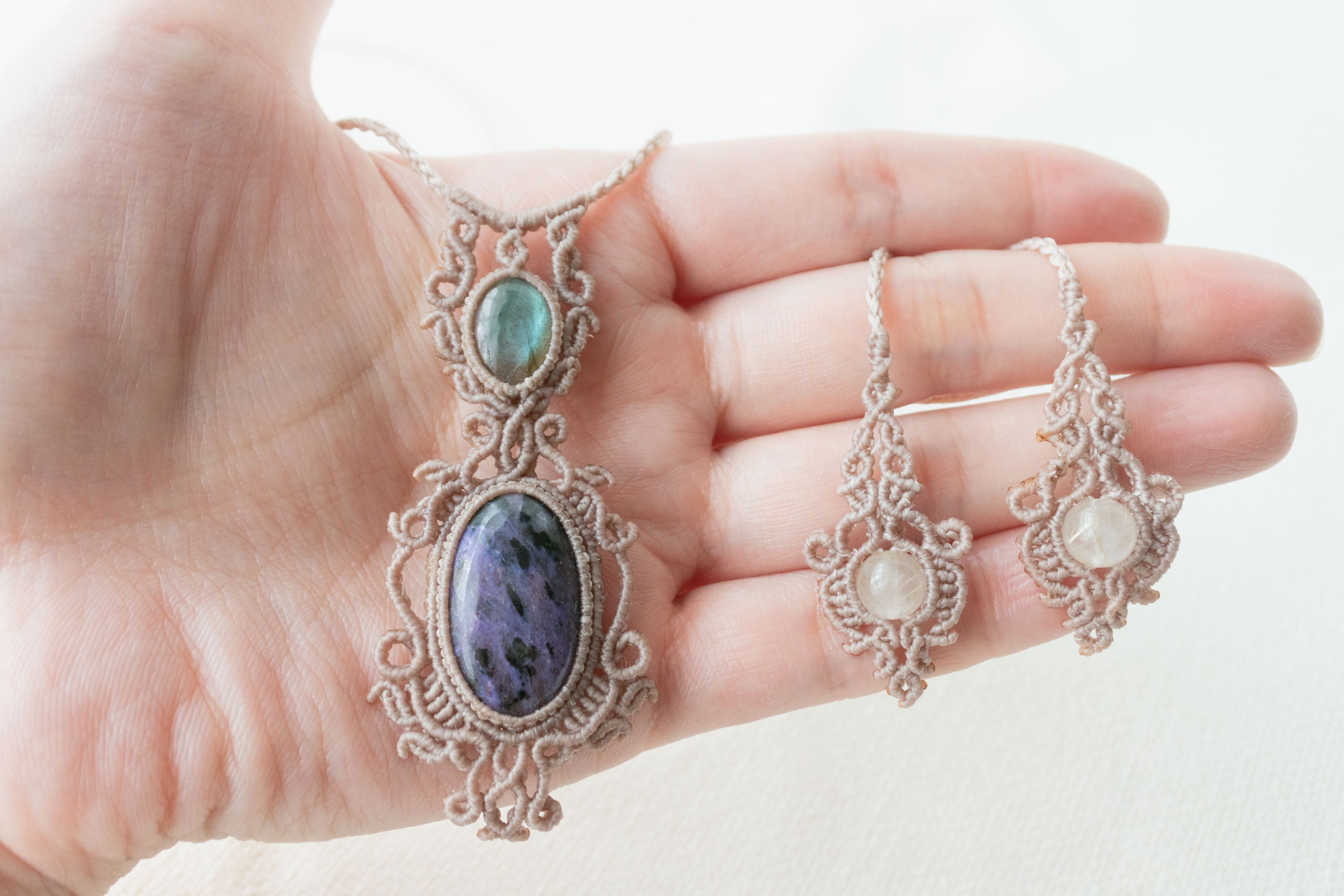 各所に紐の色が濃くなった焼き後が残りますが、マクラメジュエリーの特性として予めご了承下さい