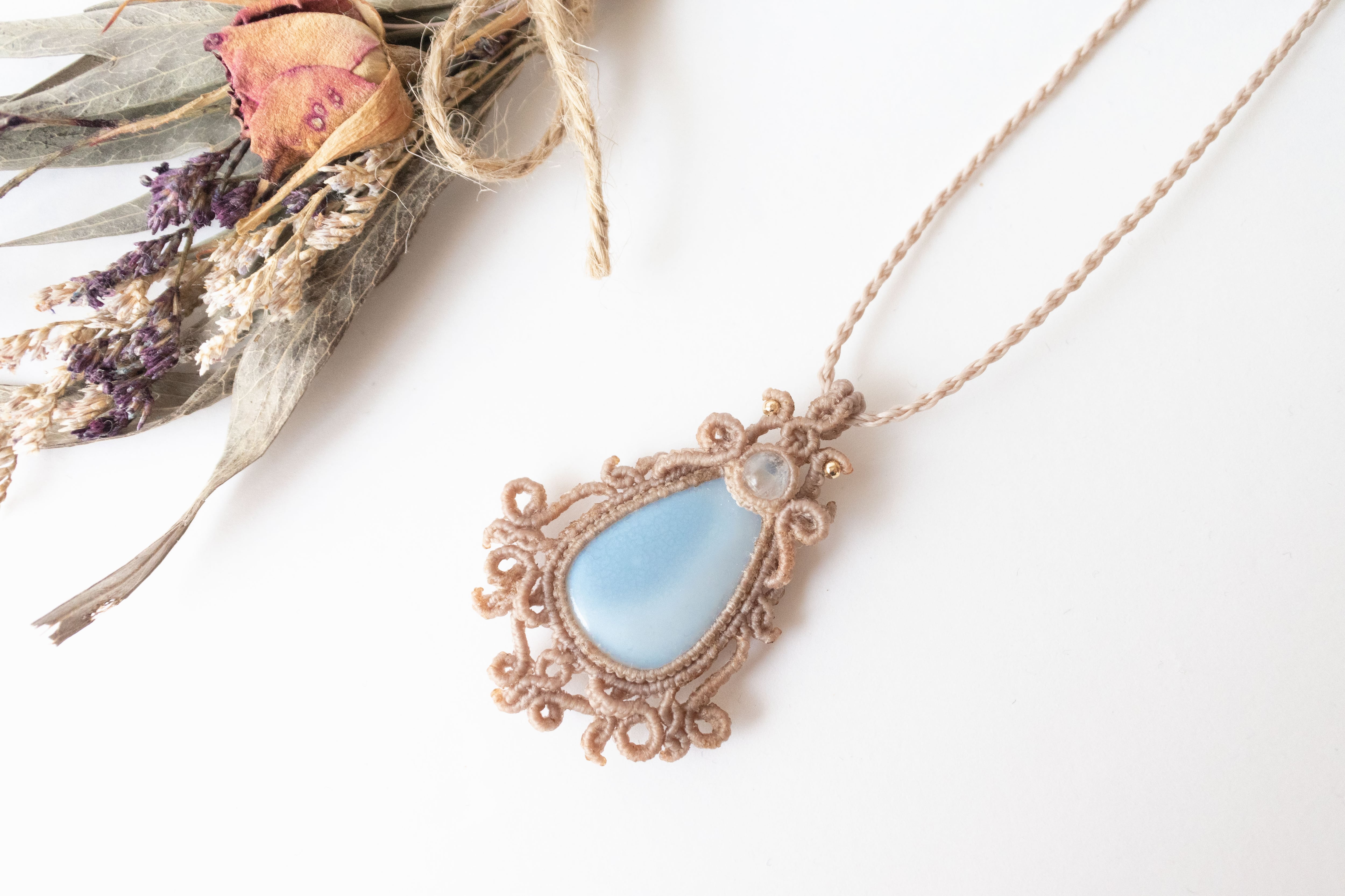 レインボームーンストーン・オン・ブルーオパールマクラメペンダント