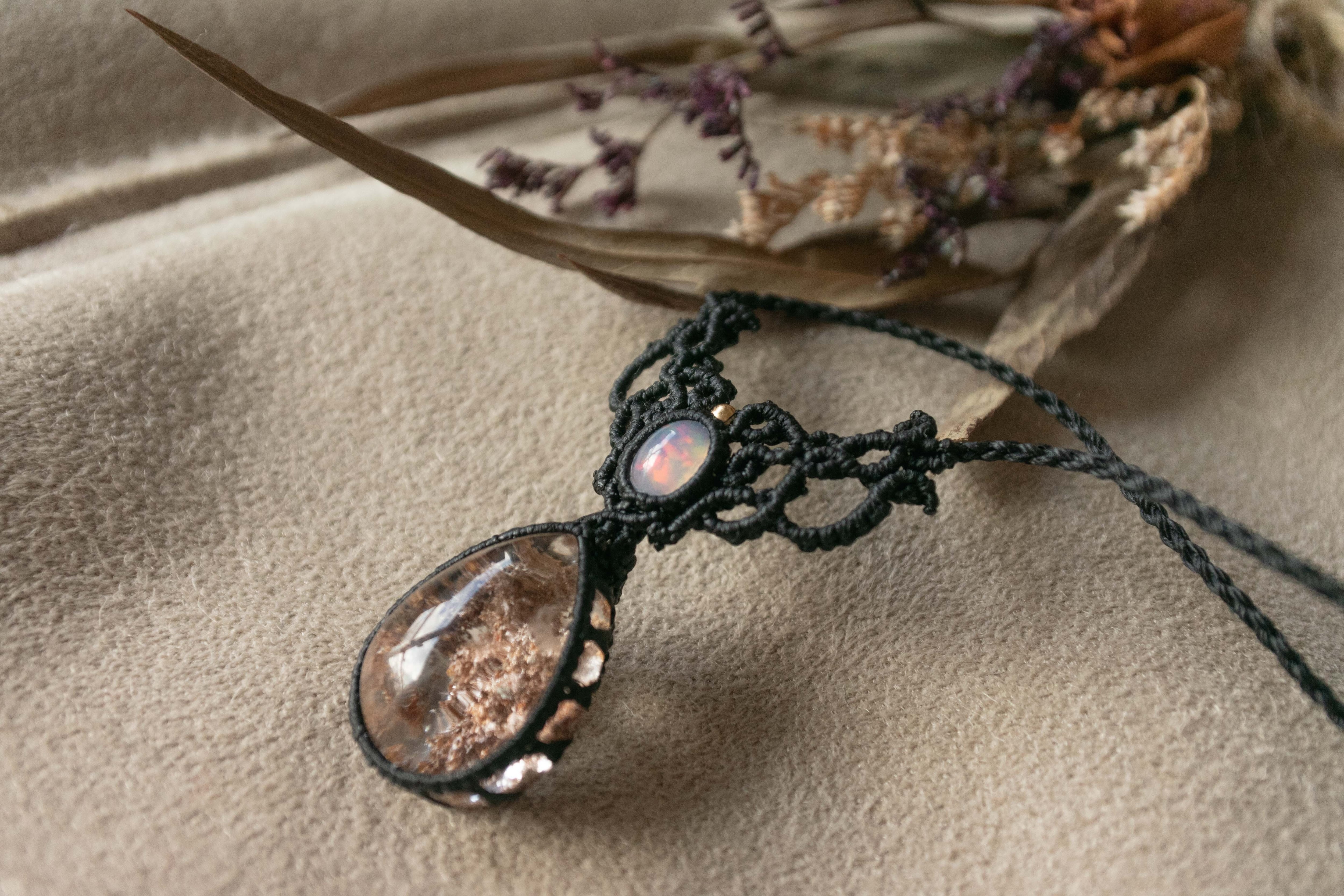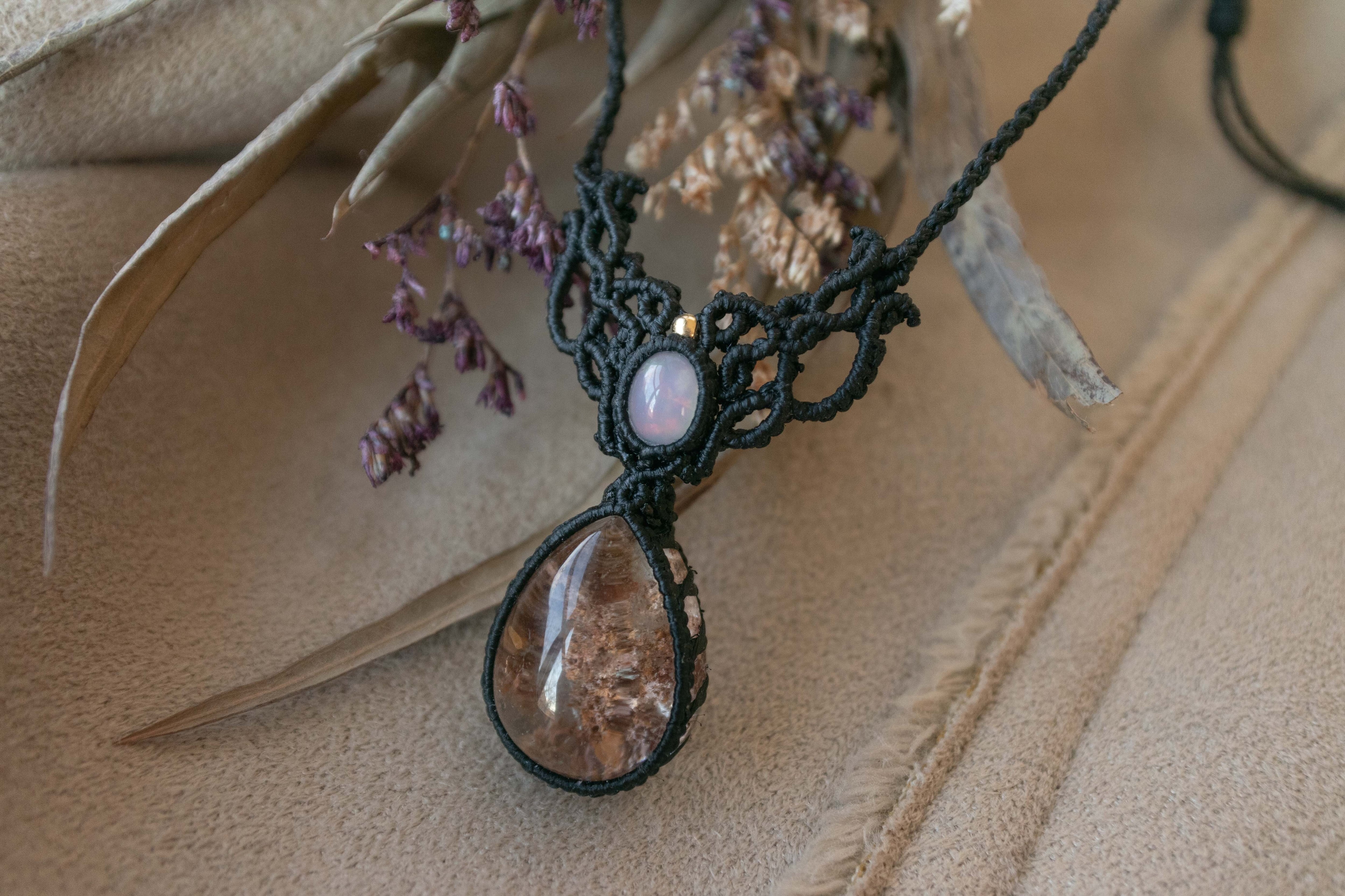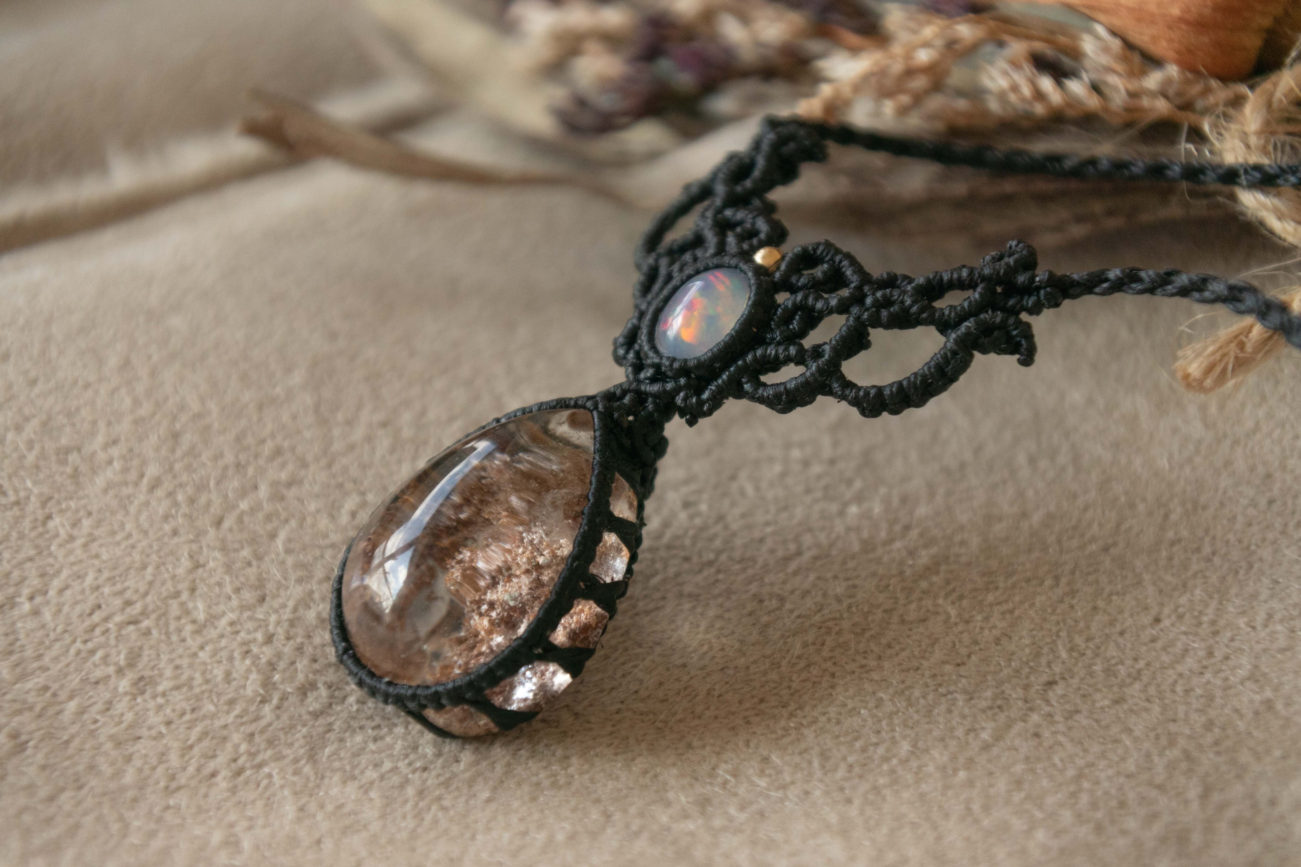 自然の神秘・ガーデンクォーツとエチオピアンオパールのマクラメネックレス